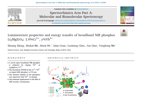 今年,《Spectrochimica Acta Part A:Molecular and Biomolecular Spectroscopy》(中科院2区,影响因子为4.2997)刊发了我院硕士研究生学术论文“Luminescence properties and energy transfer of broadband NIR phosphor Li2MgZrO4: 1.0%Cr3+, y%Yb3+”。我院2022级物理学专业硕士研究生郑爽为该论文第一作者,我院马永红教授与物理学硕士生导师贺帅为通讯作者。304永利集团为论文唯一单位和通讯单位。该研究小组依托我校“稀土发光材料”研究平台,开展了超宽带近红外发光材料设计及其在NIR光源中的应用研究,为相关领域提供了重要的理论支持和实践基础。
