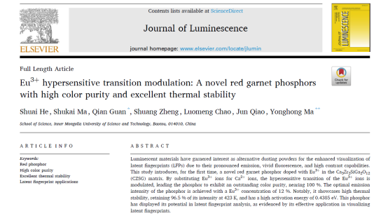 今年,我院贺帅老师在《Journal of Luminescence》(中科院2区,影响因子3.3)刊发了学术论文《Eu³⁺ hypersensitive transition modulation: A novel red garnet phosphors with high color purity and excellent thermal stability》。该研究小组依托我校“稀土发光材料”研究平台,开展了红色石榴石结构荧光材料的设计及其在光学领域的应用研究。