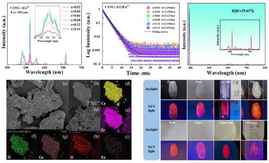 论文提出了一种基于Eu³⁺掺杂的红色石榴石型荧光材料,并系统研究了其晶体场调控与发光特性。通过优化Eu³⁺离子掺杂浓度及晶体场环境,成功实现对超敏跃迁的调控,使材料的色纯度接近100%,并在423 K高温下仍保持96.5%的发光强度。此外,该材料在可视化潜指纹等刑侦应用中展示了出色的实用性。这项研究为高性能红色荧光材料的设计提供了新思路,并在显示与刑侦领域具有重要的理论和应用价值。