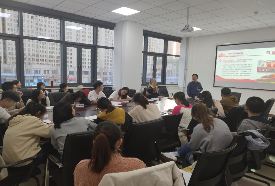 2019年11月15日下午5:00,304永利集团副书记,副院长罗宁在明德楼E206会议室,带领全体学生党员及本学期发展党员认真领悟学习党的十九届四中全会内容。