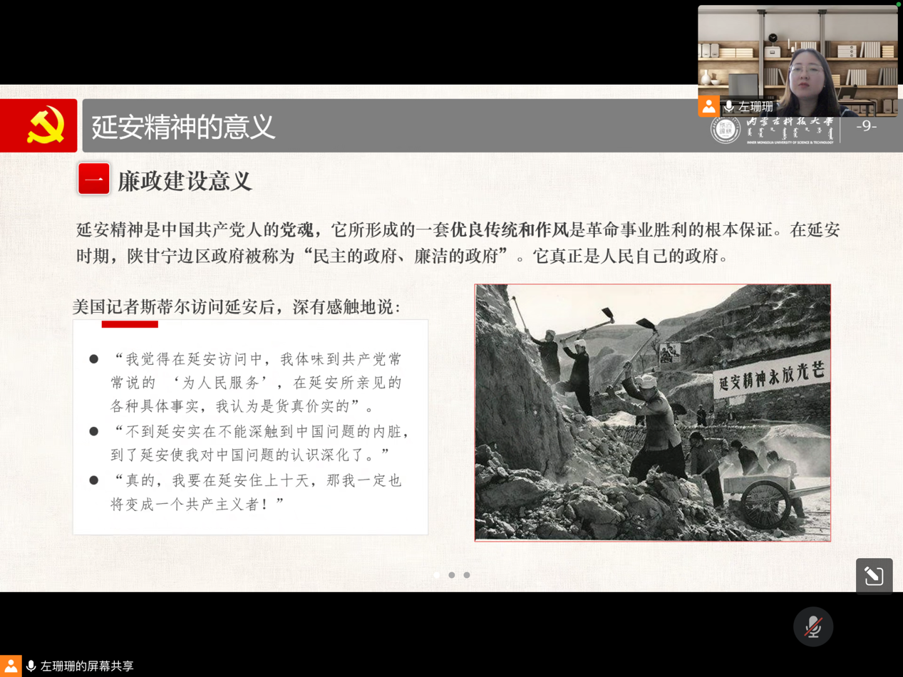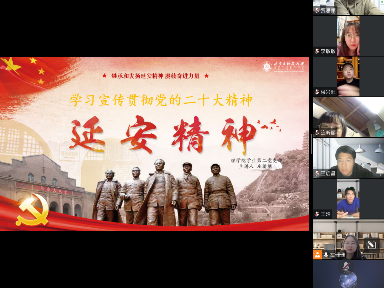 2022年11月11日,304永利集团学生第二党支部组织开展了线上“党支部书记讲授党史”专题活动。参加本次学习会的有支部全体党员和入党积极分子,大家准时上线进行学习。此次党课的主题是“延安精神”。左珊珊老师从“延安精神历史地位和评价”、“延安精神的主要内容解读”、“在新的历史条件下大力弘扬延安精神”三个方面展开论述,更进一步地解读了延安精神的现实意义。延安是中国革命的圣地,新中国的摇篮,从1935年到1948年党中央和毛泽东等老一辈革命家在延安生活和战斗了13年,领导中国革命事业从低潮走向高潮、实现历史性转折,支持了中国革命走向胜利,为中国革命事业作出了巨大贡献。正是这种为民族和人民的解放事业,为崇高的共产主义理想矢志不渝、英勇献身的精神培养形成和发展了延安精神,延安精神是民族精神的升华,是革命精神的传承,是马克思主义中国化的重要成果,是时代精神的体现。