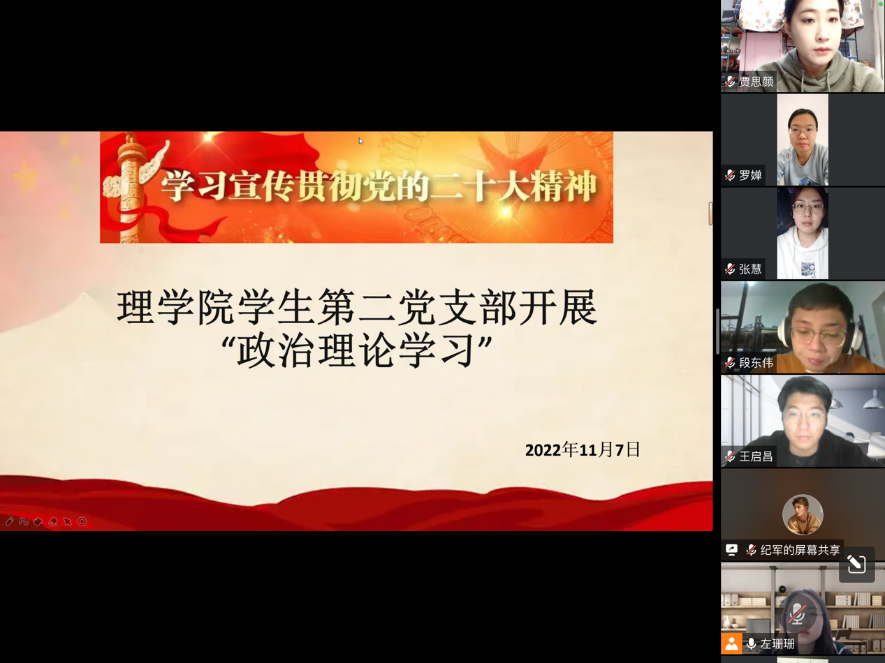 2022年11月7日,304永利集团学生第二党支部组织开展了学习宣传党的二十大精神线上政治理论学习会。参加本次学习会的有支部全体党员20名,大家准时上线进行学习。