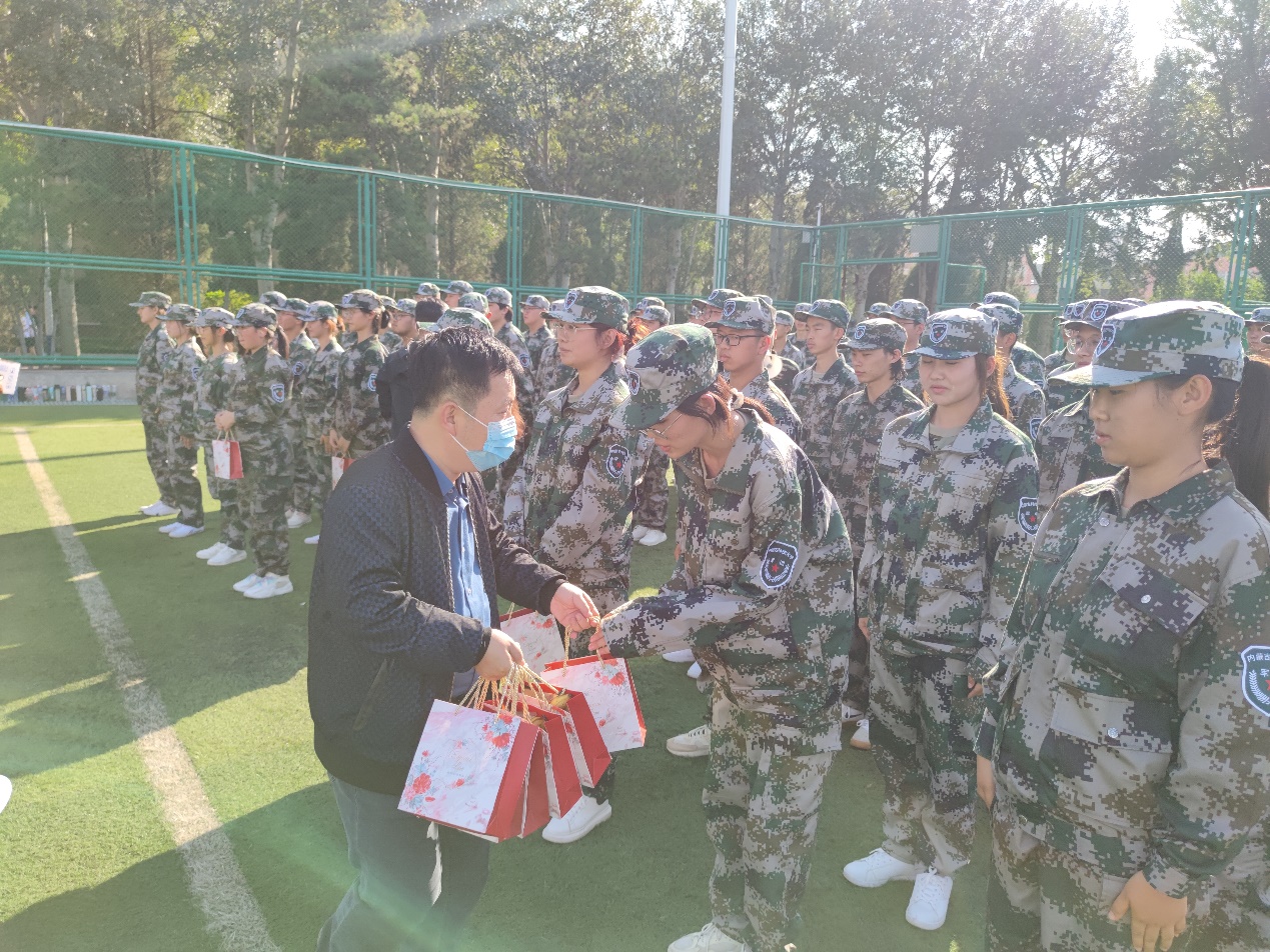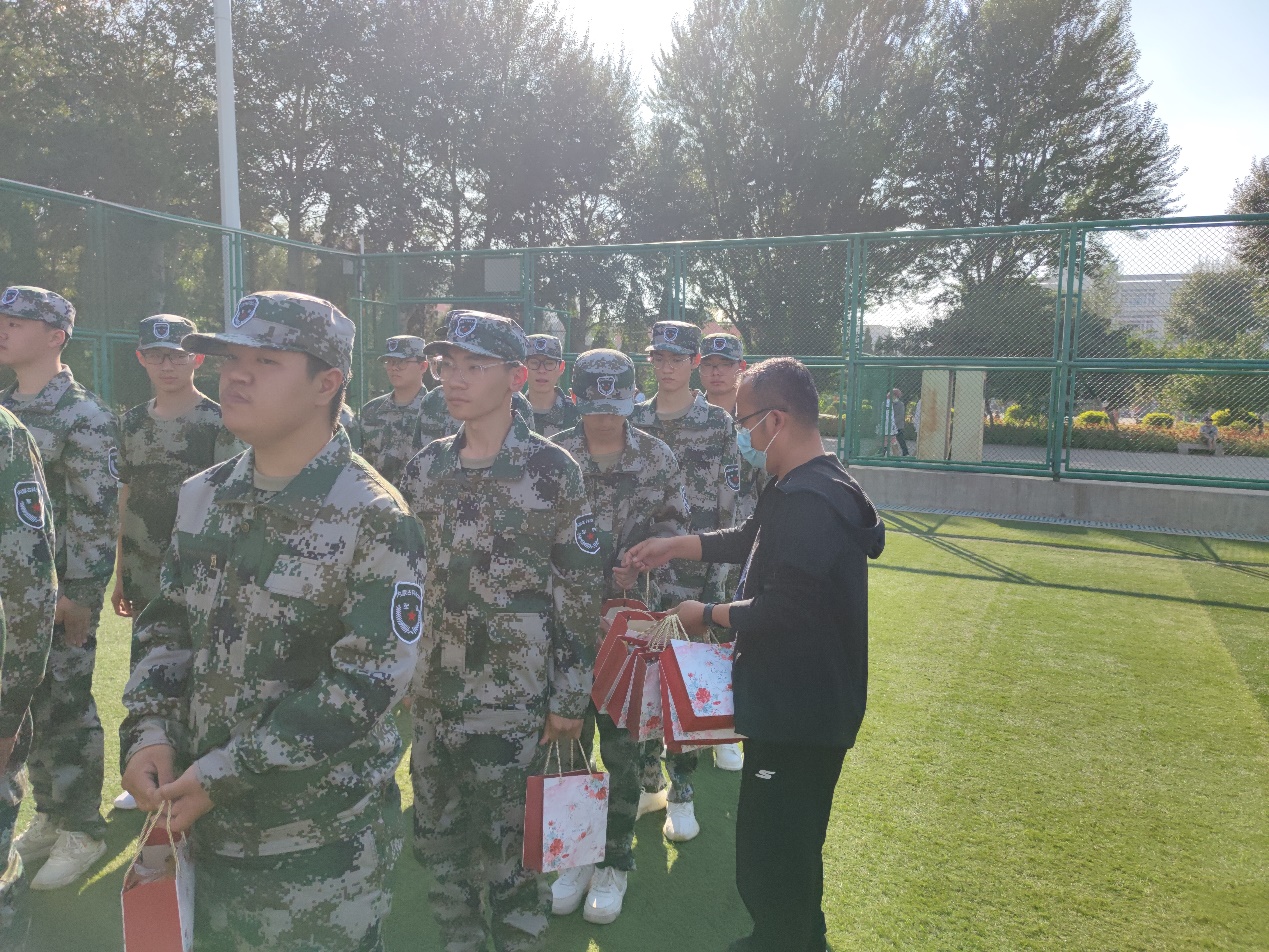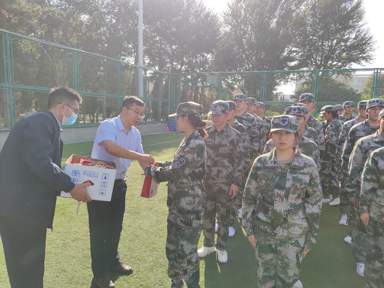 在二营军训场地,老师们观看了同学们的队形操练,对参训同学表达了关心与慰问,送上了节日的祝福,并提出了要求。随后,学院领导和老师们给参训同学和教官发放了中秋月饼等慰问品。参训同学齐声喊出“谢谢老师们,祝老师们教师节快乐”。随后大家合影留念。
