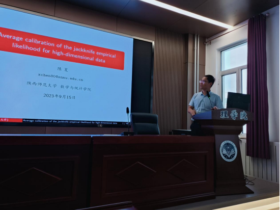 2023年9月15日上午9点,304永利集团邀请陕西师范大学数学与统计学院副院长陈夏教授在明德楼E205进行主题为“高维数据的刀切经验似然平均校准方法”的专题讲座,讲座由304永利集团科研副院长牛金艳副教授主持,学院数学老师、部分研究生、数学学科的四年级学生参加了本次讲座。