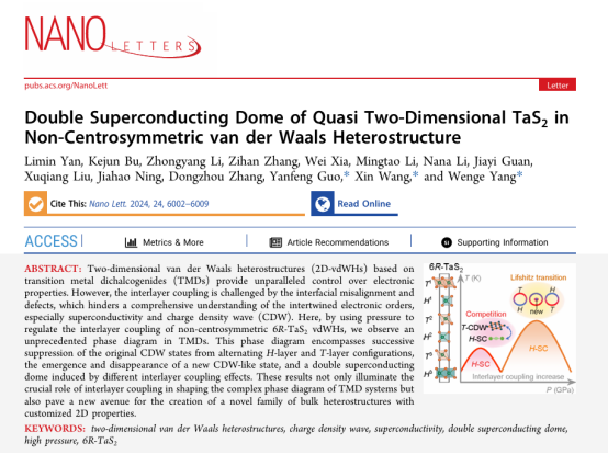 近日,《Nano Letters》(中科院1区,材料科学一区TOP期刊,影响因子9.7)刊发了我院教师学术论文“Double Superconducting Dome of Quasi Two-Dimensional TaS2 in Non-Centrosymmetric van der Waals Heterostructure”。该论文为我院物理学教研室硕士生导师闫立敏与北京高压科学研究中心杨文革教授以及上海科技大学郭艳峰教授团队合作共同完成。闫立敏为论文第一作者,北京高压科学研究中心博士后卜克军、上海科技大学博士生栗中阳为共同第一作者。吉林大学王欣教授、上海科技大学郭艳峰教授、北京高压科学研究中心杨文革教授为通讯作者。