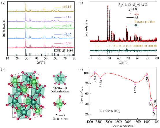 本文采用高温固相法合成了一系列x% Ho3+:YbNbO4 (x = 1, 2, 5, 10, 15)荧光粉,表征了其晶体结构。结果表明,Ho3+离子掺入并没有破坏YbNbO4的晶格结构,但使得晶格常数出现细微增大。通过对不同浓度Ho3+离子掺杂样品的发射光谱测试,筛选出最佳的Ho3+离子浓度为2%,测试了2% Ho3+∶YbNbO4样品在0.05~0.23 W功率范围内的发射光谱。结果表明,Ho3+离子特征发射峰的位置和形状不随激发光功率的变化而改变,拟合激发光功率与发射峰的积分强度,证明Ho3+离子的绿光和红光发射都是双光子过程。此外,应用荧光分支比LIR技术计算得到了材料的绝对灵敏度和相对灵敏度分别在570 K和420 K时达到最大值0.69%•K-1和0.36%•K-1,与其他Yb3+/Ho3+离子共掺的荧光粉材料相比,具有较高的灵敏度,说明该材料在非接触式光学温度测量方面具有潜在的应用前景。