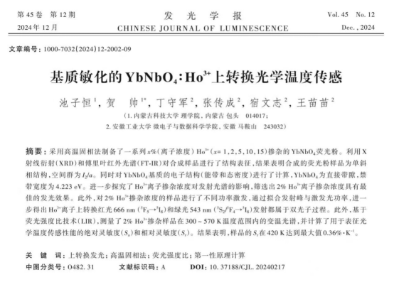 今年,我院22级应用物理学本科生池子恒在《发光学报》(EI期刊,影响因子1.35)刊发了学术论文《基质敏化的YbNbO4: Ho3+上转换光学温度传感研究》,论文的通讯作者为贺帅老师。该研究小组依托我校“稀土发光材料”研究平台,开展了不同浓度Ho3+掺杂基质敏化的YbNbO4的上转换光学温度传感研究。