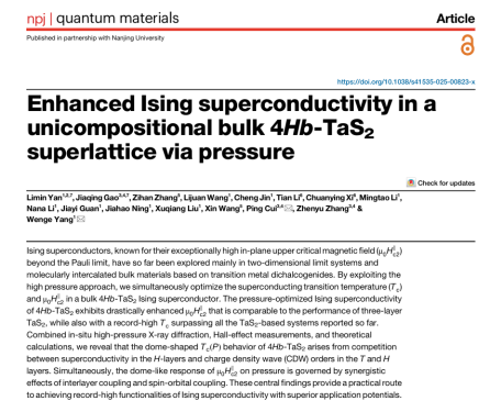 近日,我院硕士生导师闫立敏老师以第一作者在量子材料领域权威期刊《npj Quantum Materials》(中科院1区Top,影响因子5.4)发表题为“Enhanced Ising superconductivity in a unicompositional bulk 4Hb-TaS2 superlattice via pressure”的学术论文。