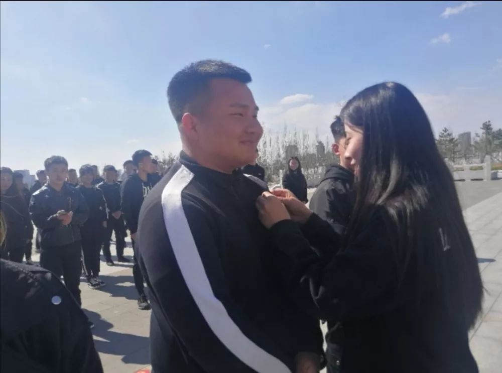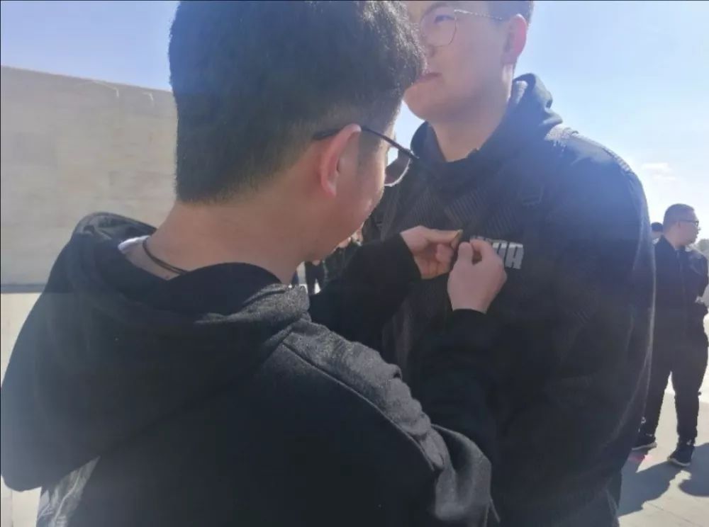 6.团总支副书记邢仙果,宣传委员任杰为全体团员佩戴团徽并提出希望。