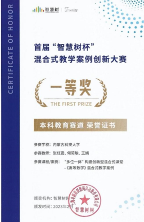 在近日落下帷幕的首届“智慧树杯”混合式教学案例创新大赛中,我院张红霞、何莉敏、王娟三位老师组成的高等数学混合式教学创新团队报送的参赛案例经过初赛和复赛两轮评选斩获殊荣,获得本科赛道一等奖。