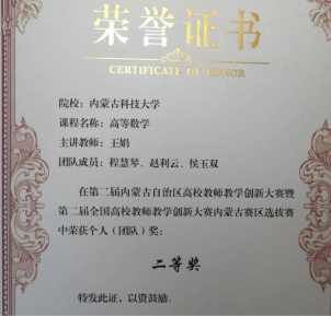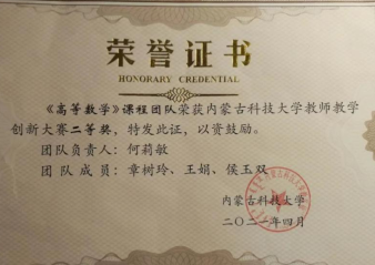 此外,团队成员多年来一直从事《高等数学》课程的教学工作,积极参与教学培训,开展教学研究,主动进行课程和专业建设,全身心投入课堂教学和改革创新,并在各类教学比赛中获得优异成绩。