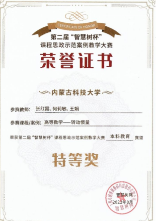 该教学团队2022年7月在第二届“智慧树杯”课程思政示范案例教学大赛中荣获特等奖。由于成绩突出,团队张红霞副教授受聘成为“智慧树高等教育研究院”特聘专家,聘期叁年。
