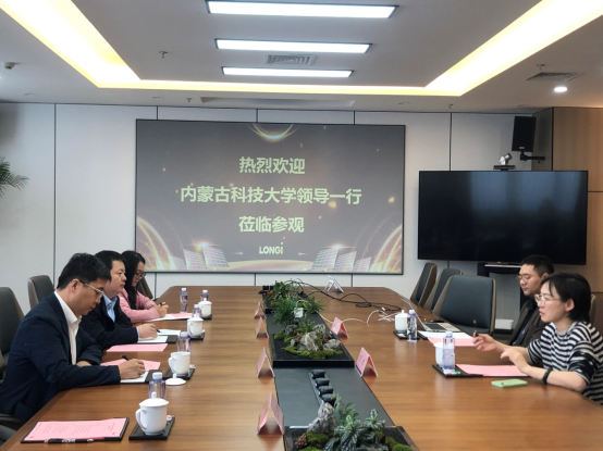 参观结束,校企双方举行了座谈会,隆基绿能股份有限公司电池制造中心校园招聘经理王粒、招聘经理鲍世杰等出席座谈会。王粒首先表达了欢迎之情,详细介绍了公司的基本情况、发展理念、科学研究、行业规模和校招情况。她表示,希望双方能够以此交流为契机,共同构建长期有效的机制,持续推进双方交流与合作向更深层次发展。